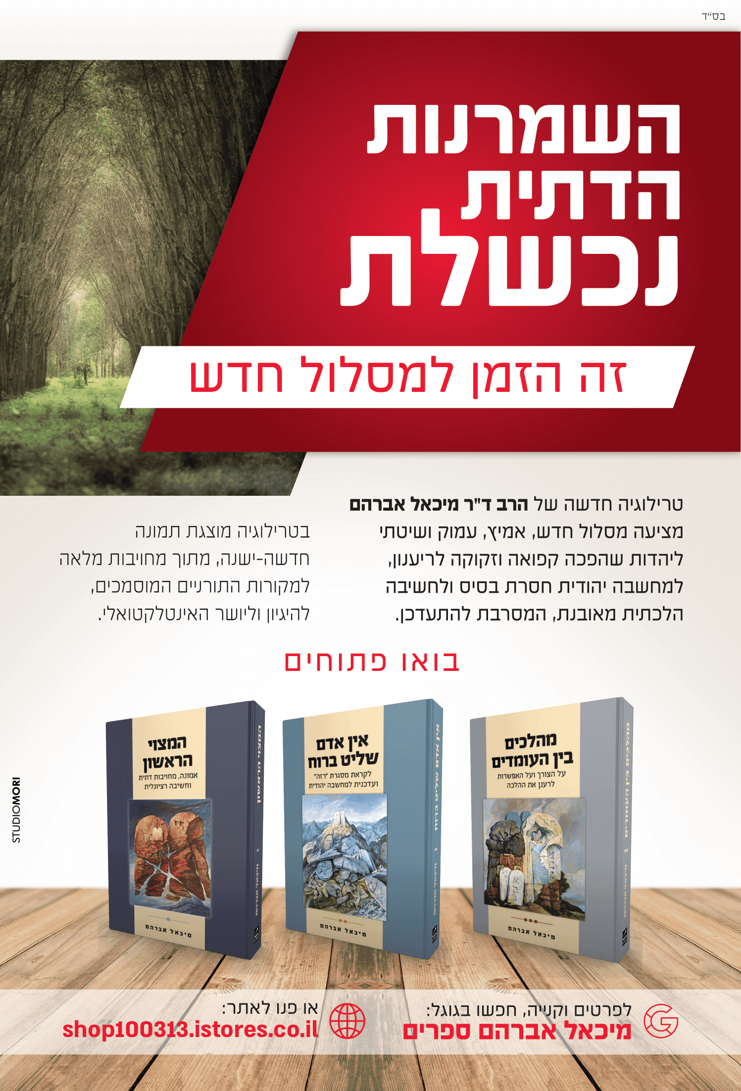 This coming Sabbath an ad for the trilogy is scheduled to appear in the newspaper. We posted it in several forums in order to receive reactions, and quite a few of the responses claimed that it was condescending, dogmatic, and overly provocative. To tell the truth, that surprised me greatly, since from my point of view there was nothing of the sort in it. I thought it proper to explain the matter, if only out of appreciation for all those who participate in the discussion and engagement with these issues in the various groups. I will do so relatively briefly, because I have already discussed almost all of these matters more than once.